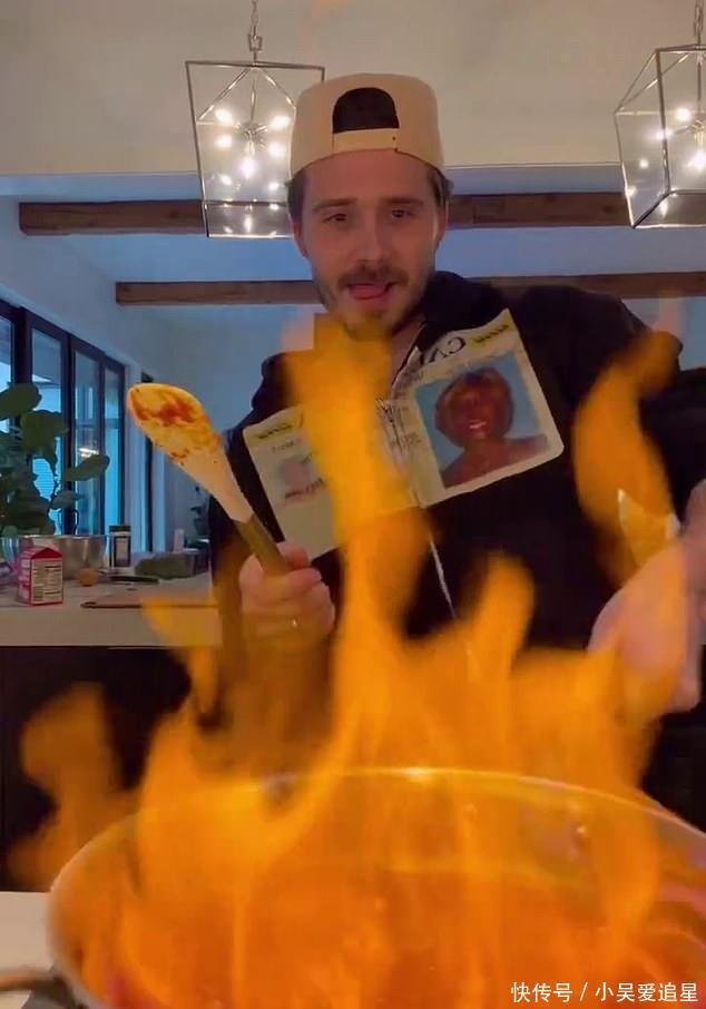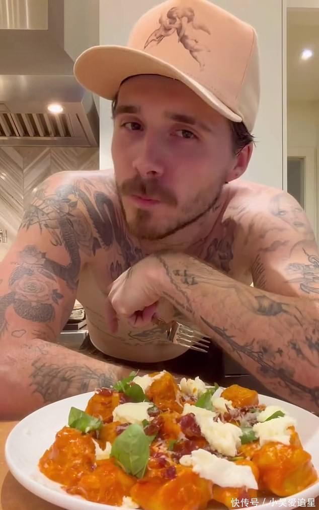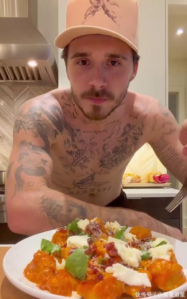 当地时间12月1日,贝克汉姆家族那赘到美国的大儿子布鲁克林,拍视频向粉丝展示他的厨艺。叉烧布这小子戏特别多,明明是秀厨艺,搞到最后竟顺便开始秀身材。他脱了上衣,露出他布满纹身的上半截身体,并盯着镜头露出一副“看我多英俊帅气”的表情。