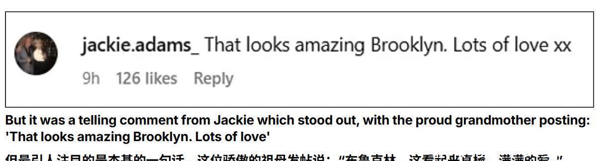 杰基平常没少去叉烧布的社交账号里关注和鼓励他。当他发布牛威灵顿时,她就回复他:“布鲁克林,这看起来真棒。满满的爱。”
