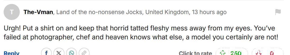 惹得网友嘲讽他:“哎呀!穿上衬衫,别让你那难看的、满是纹身的肉堆出现在我眼前。你当摄影师不行,当厨师也不行,天知道你还干过什么,模特这活儿你肯定干不了!”不得不说,网友的评论非常中肯!他这一身肉不知道是吃了多少软饭喂出来的。