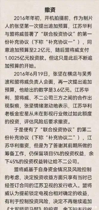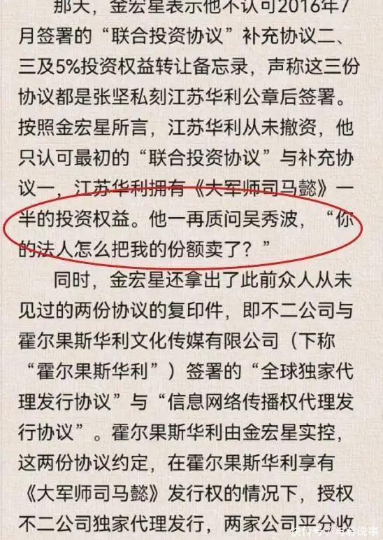 这时候,一份极其诡异的“补充协议”出现了。 这份协议里白纸黑字写着: 华利公司自愿撤资,把那45%的投资权益都转给吴秀波的不二文化。 吴秀波一看,居然有这种好事?